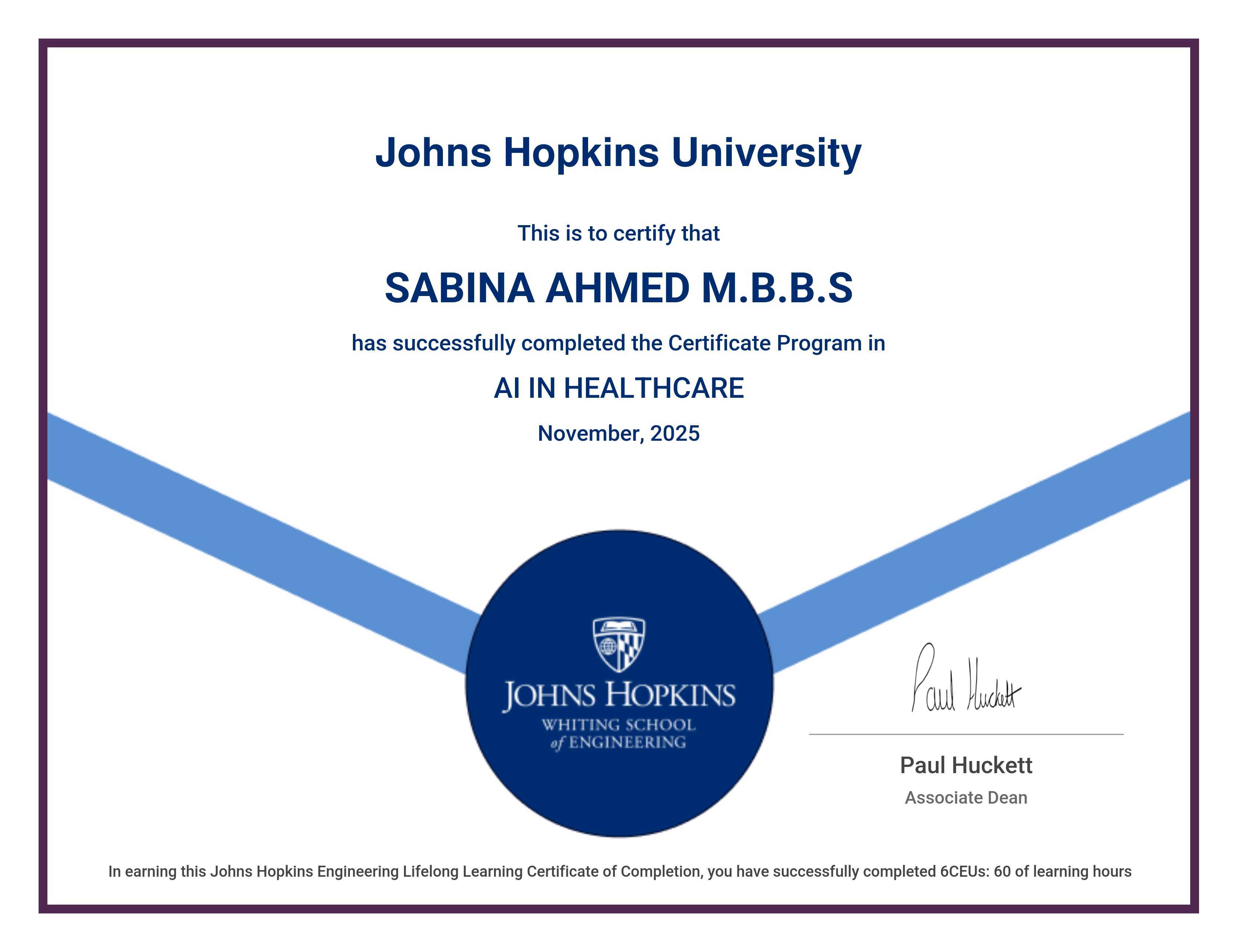 The certificate below verifies that SABINA AHMED M.B.B.S has completed the AI IN HEALTHCARE