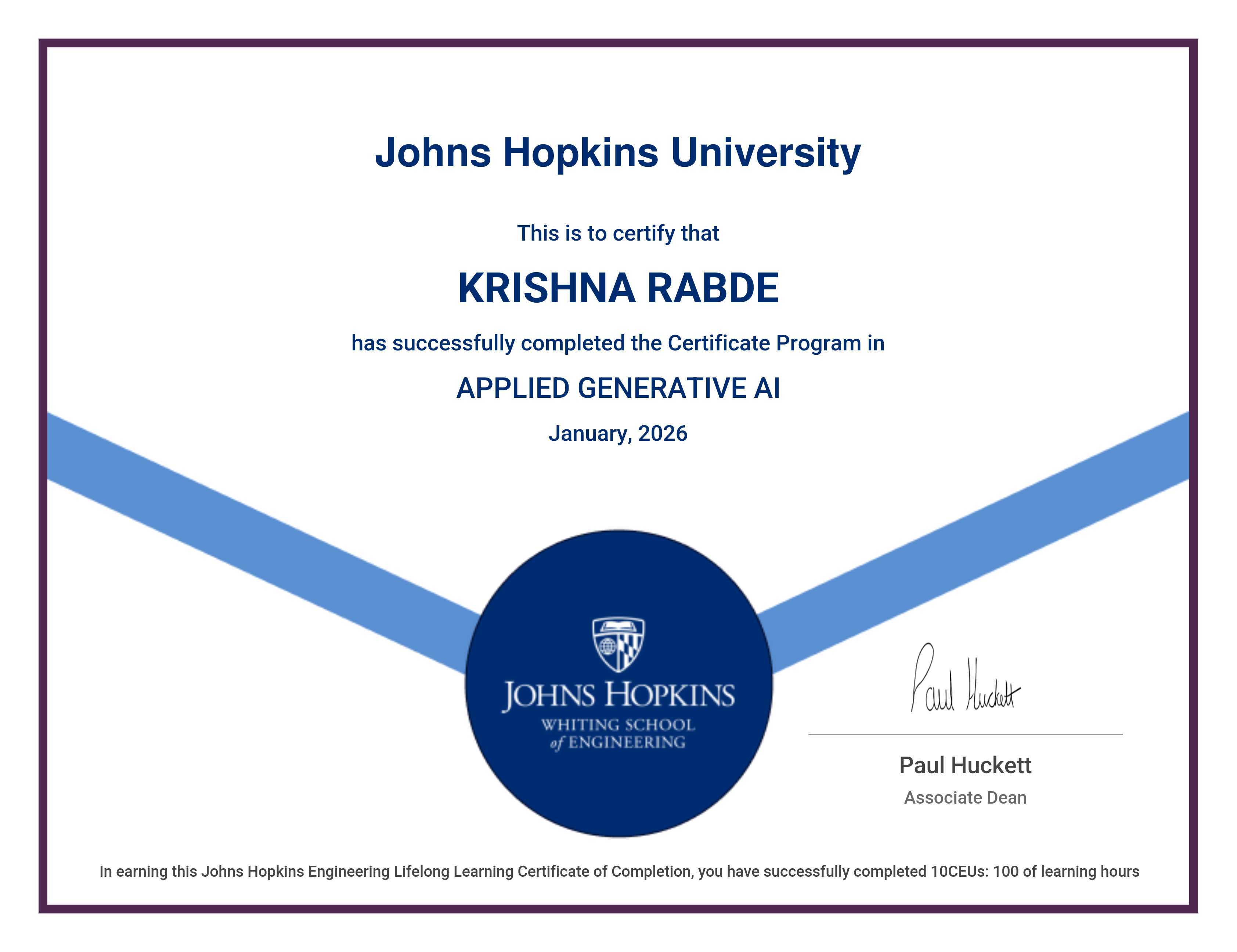 The certificate below verifies that KRISHNA RABDE has completed the APPLIED GENERATIVE AI