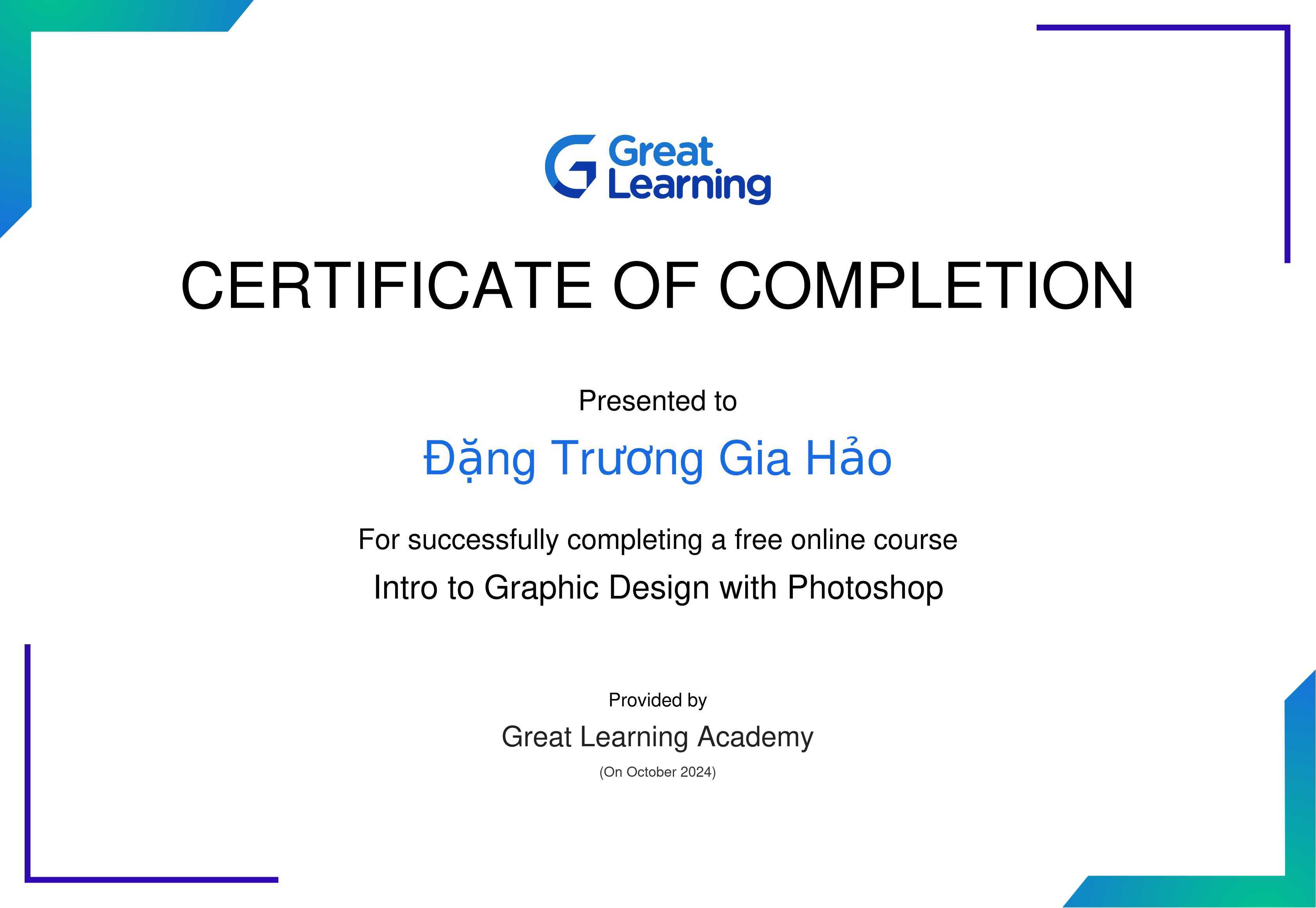 The certificate above verifies that Đặng Trương Gia Hảo has successfully completed the course Intro to Graphic Design with Photoshop