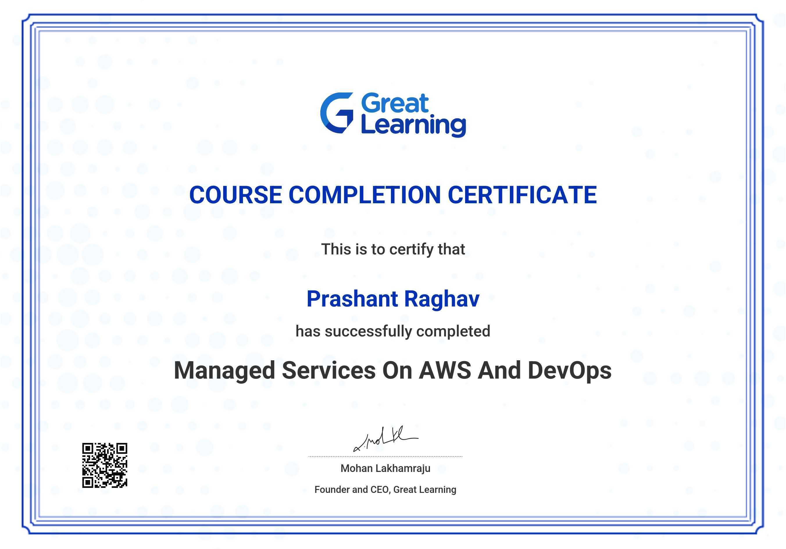 The certificate below verifies that Prashant Raghav has completed the Managed Services on AWS and DevOps course