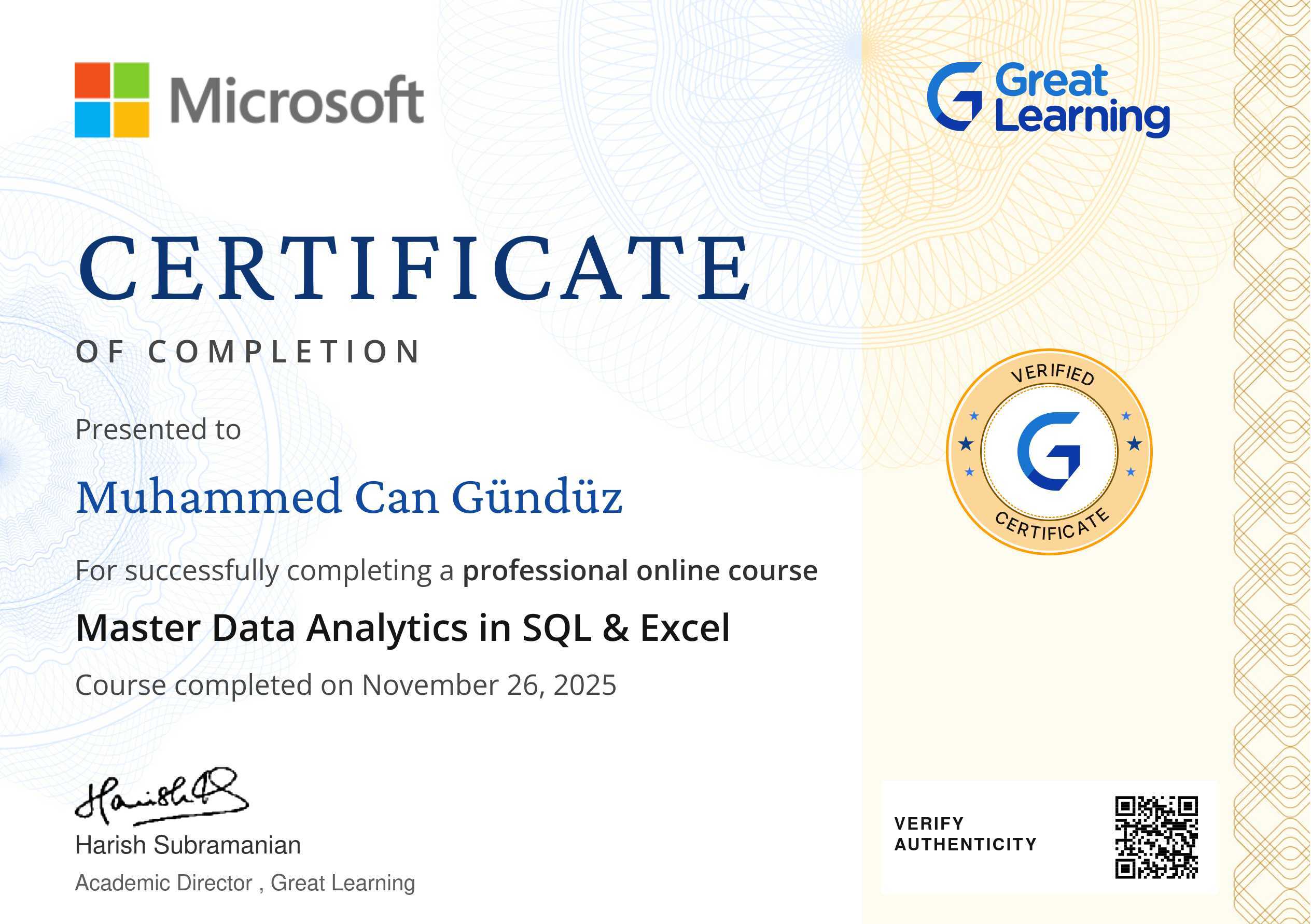The certificate above verifies that Muhammed Can Gündüz has successfully completed the course Master Data Analytics in SQL & Excel