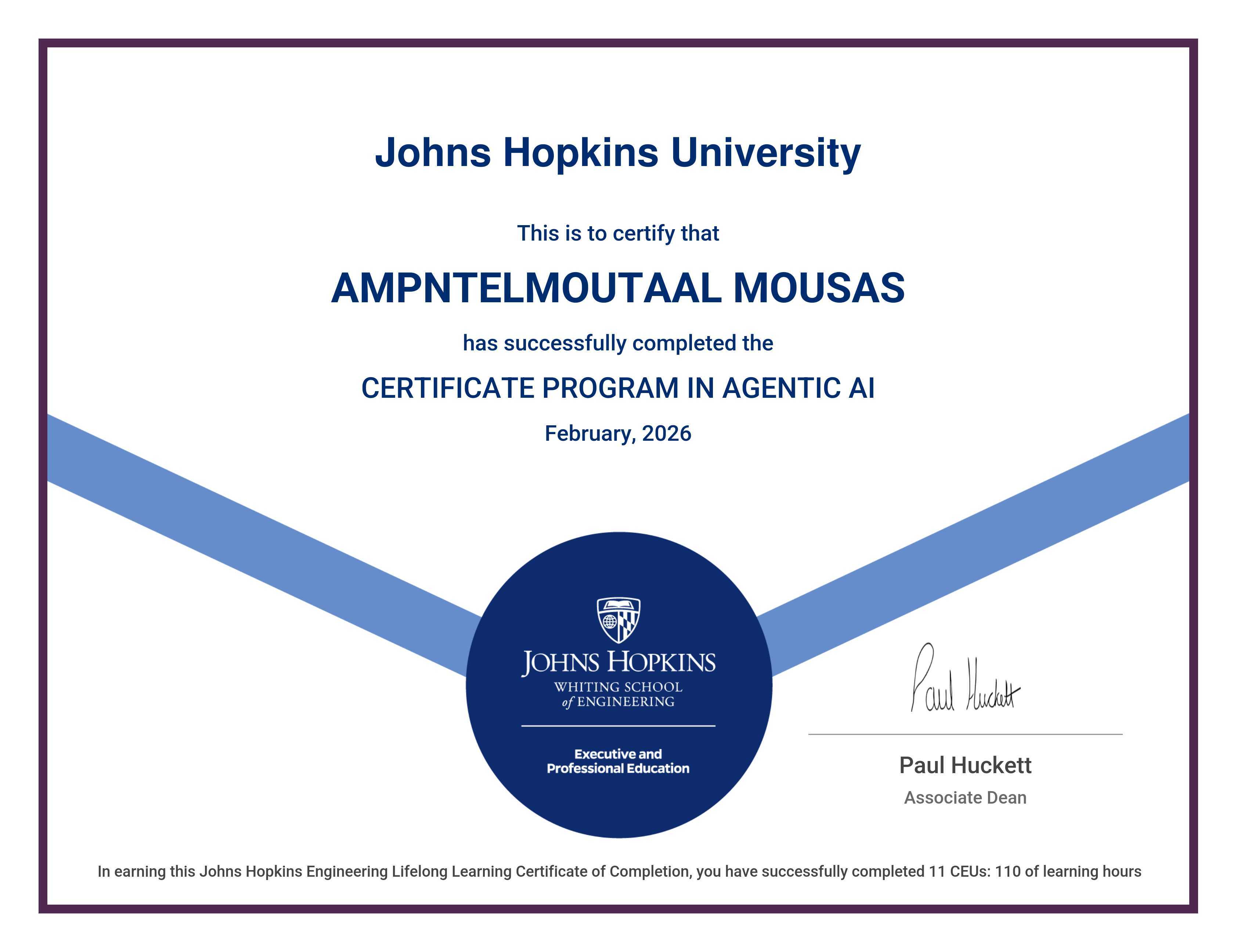The certificate below verifies that AMPNTELMOUTAAL MOUSAS has completed the CERTIFICATE PROGRAM IN AGENTIC AI