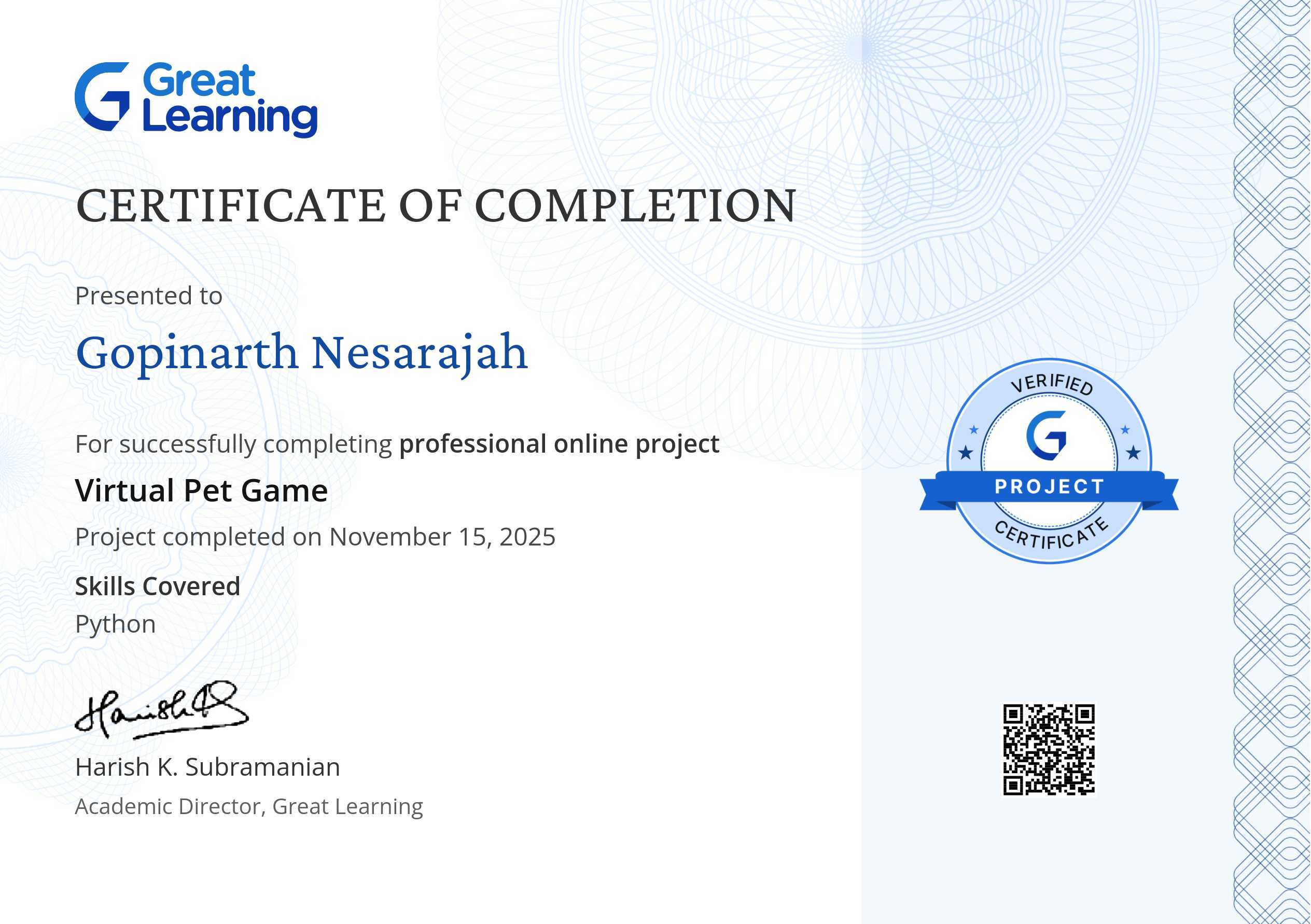 The certificate above verifies that Gopinarth Nesarajah has successfully completed the guided project Virtual Pet Game